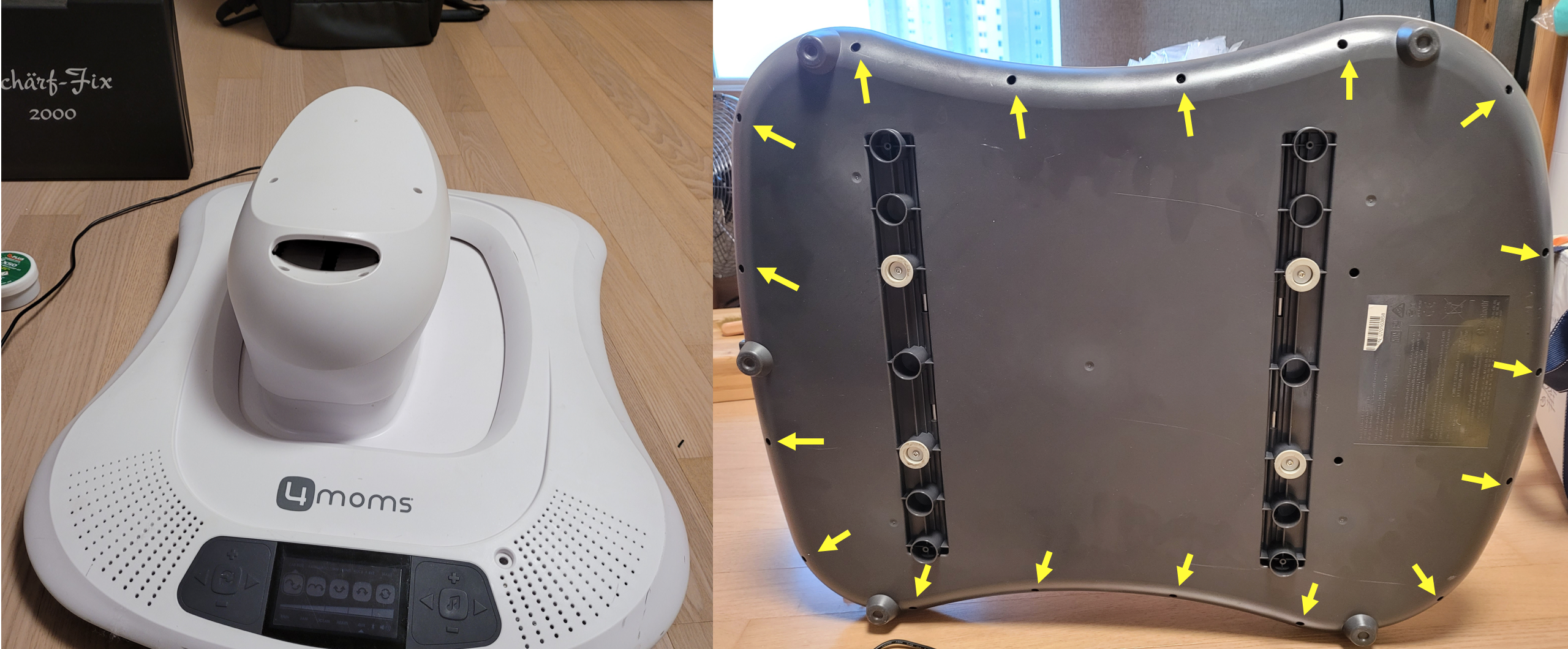 아기 침대부분은 나사 못 제거 필요없이 고정 락을 누른후 빼면 쉽게 제거가 되고, 바닥은 바닥에 있는 나사못을 모두 제거하면 쉽게 분해 가능하다. 껍데기를 제거하면 모터가 구동되는 동력장치를 볼수가 있는데, 동작을 시켜보면서 마찰이 일어나는 부분에 꼼꼼히 구리스를 발라준다.